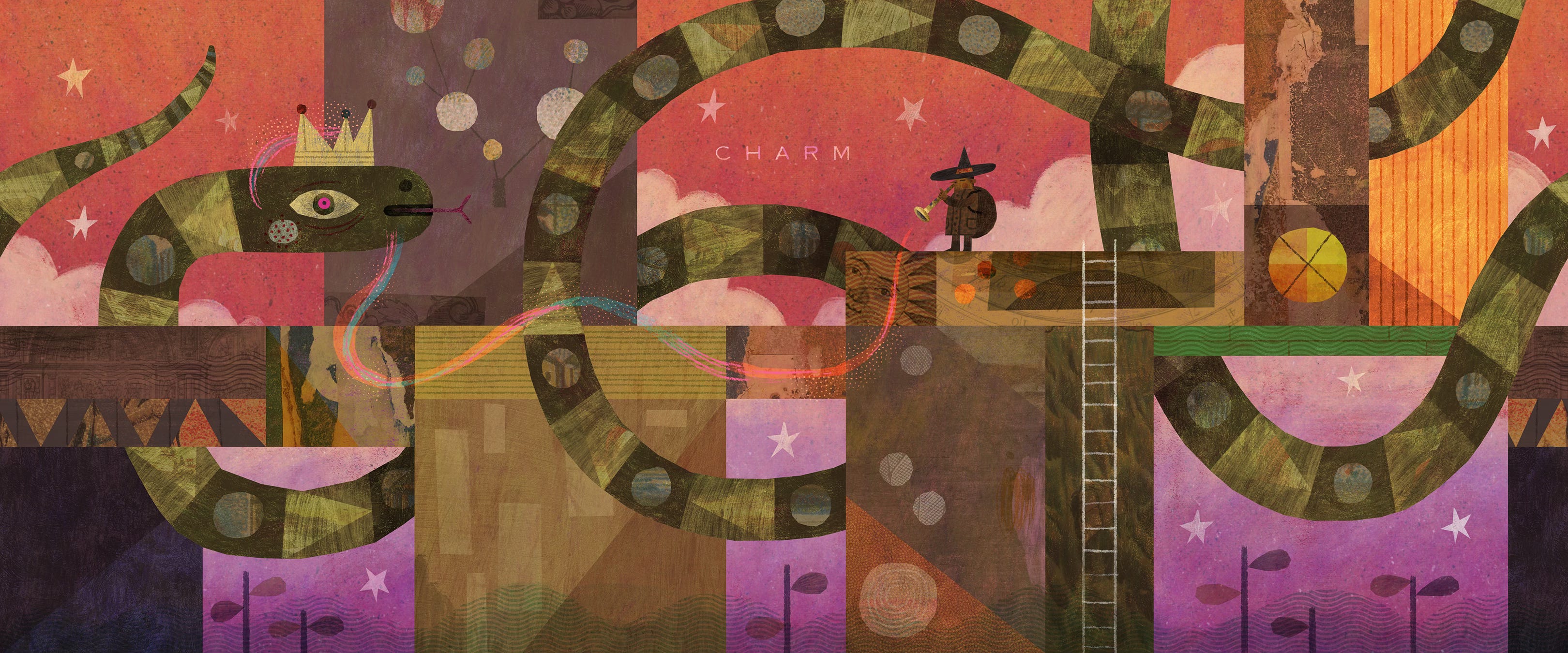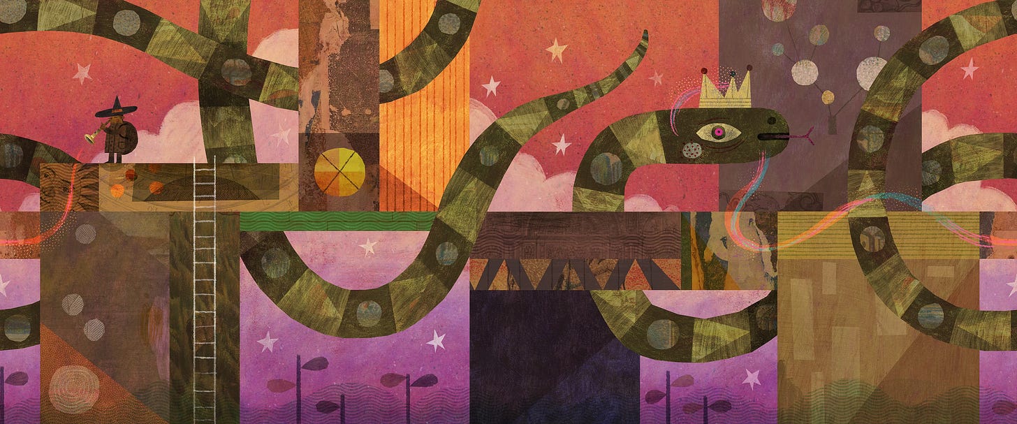 Folktale Week continues! Ok, I ran out of time and wanted to do the remaining 3 images justice. This one was a bear (er, snake!) to work on. I liked the weirdness of the blocks of shapes that break up the image, but getting it all to work together was a major challenge. I’m proud of where it ended up. 2 more to go.
